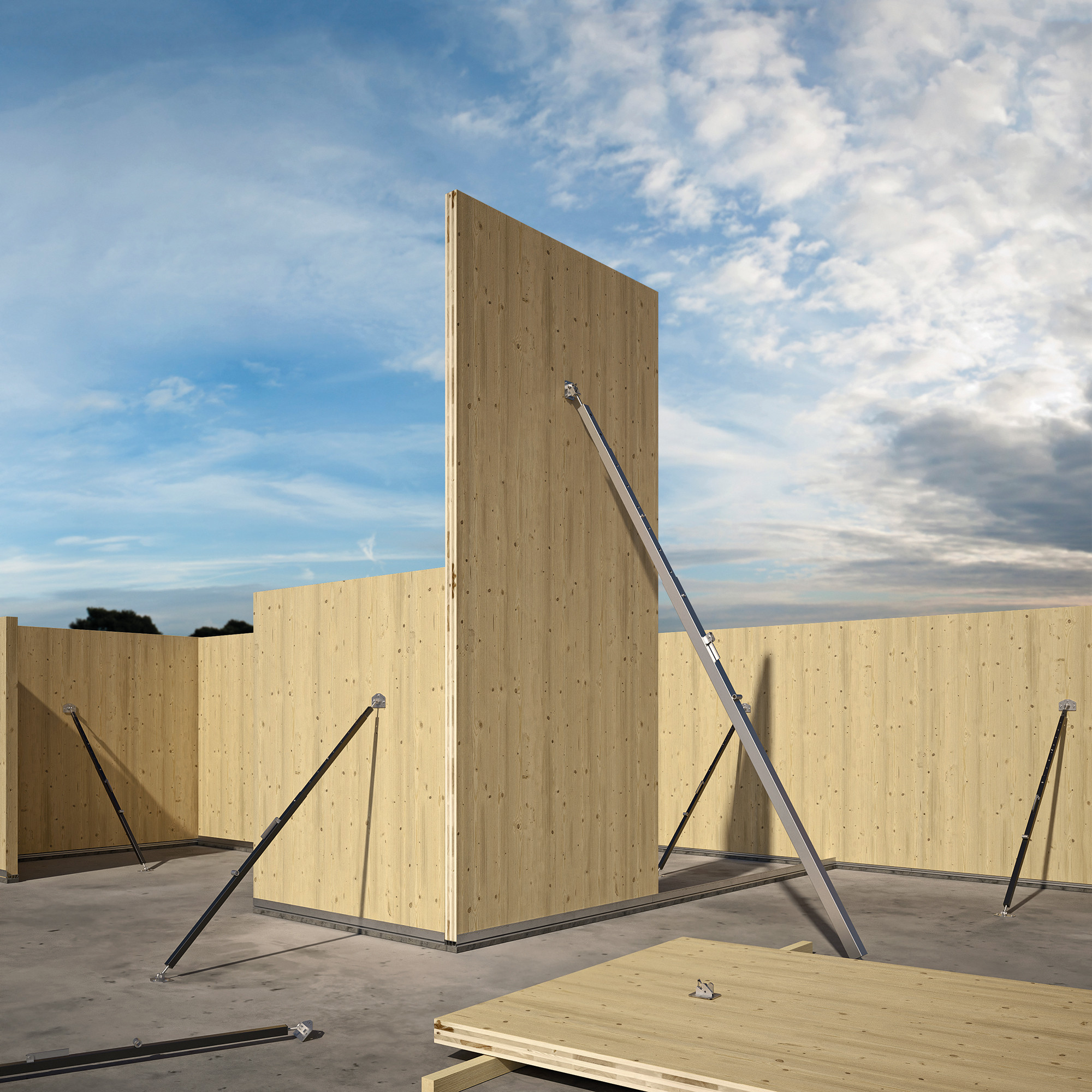 GIRAFFE é utilizado como suporte temporário para a montagem CLT, mas também para elementos de armação, pré-fabricados em madeira, suportes e pilares de madeira lamelada e muito mais.