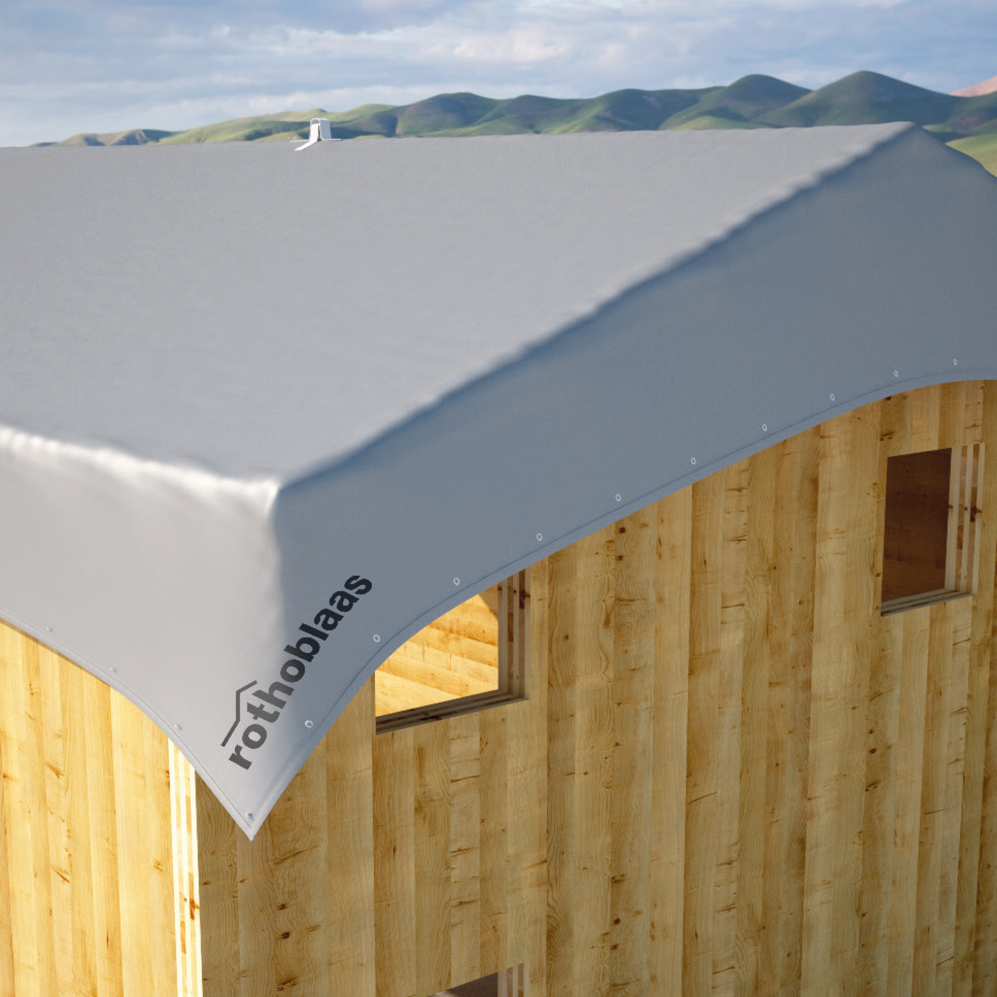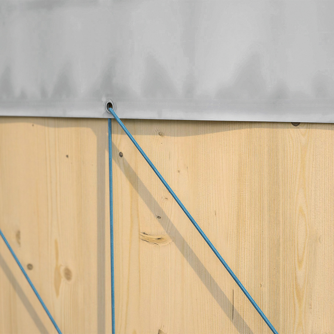Disponível em três tamanhos standard e personalizados, está equipado com um gancho de elevação para facilitar a instalação e olhais metálicos posicionados a cada metro para fixação à cobertura.