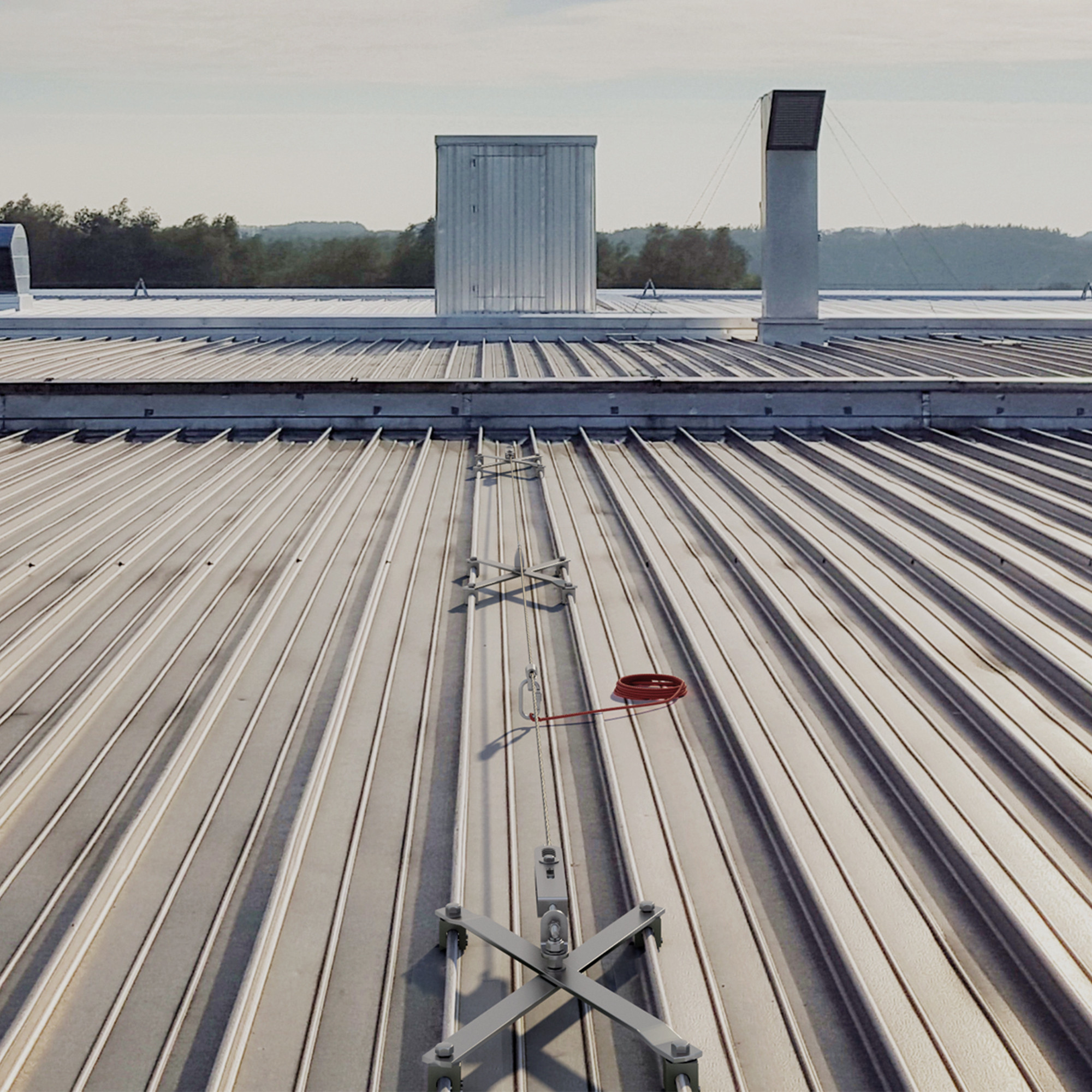 Com o sistema PATROL e o suporte SEAMO pode realizar linhas de vida em coberturas de chapa agrafada redonda. É rápido e seguro de instalar em diferentes entre-eixos de agrafagens.